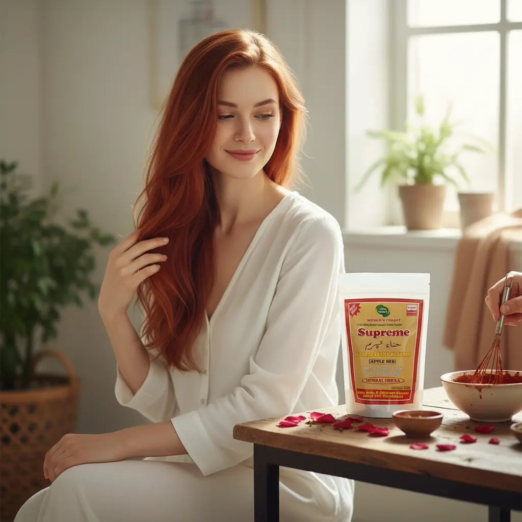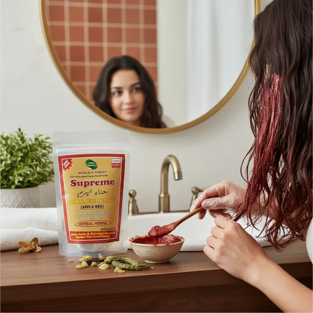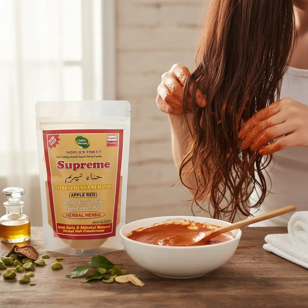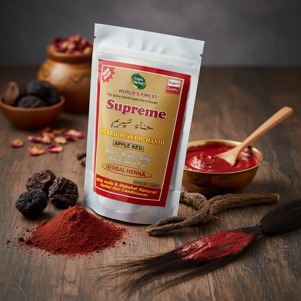 Supreme Herbal Henna Mehndi Powder (Apple Red) ek premium herbal hair care product hai jo aapke baalon ko natural color dene ke saath-saath unhe nourish bhi karta hai. Yeh specially un logon ke liye perfect hai jo chemical-free hair coloring chahte hain.