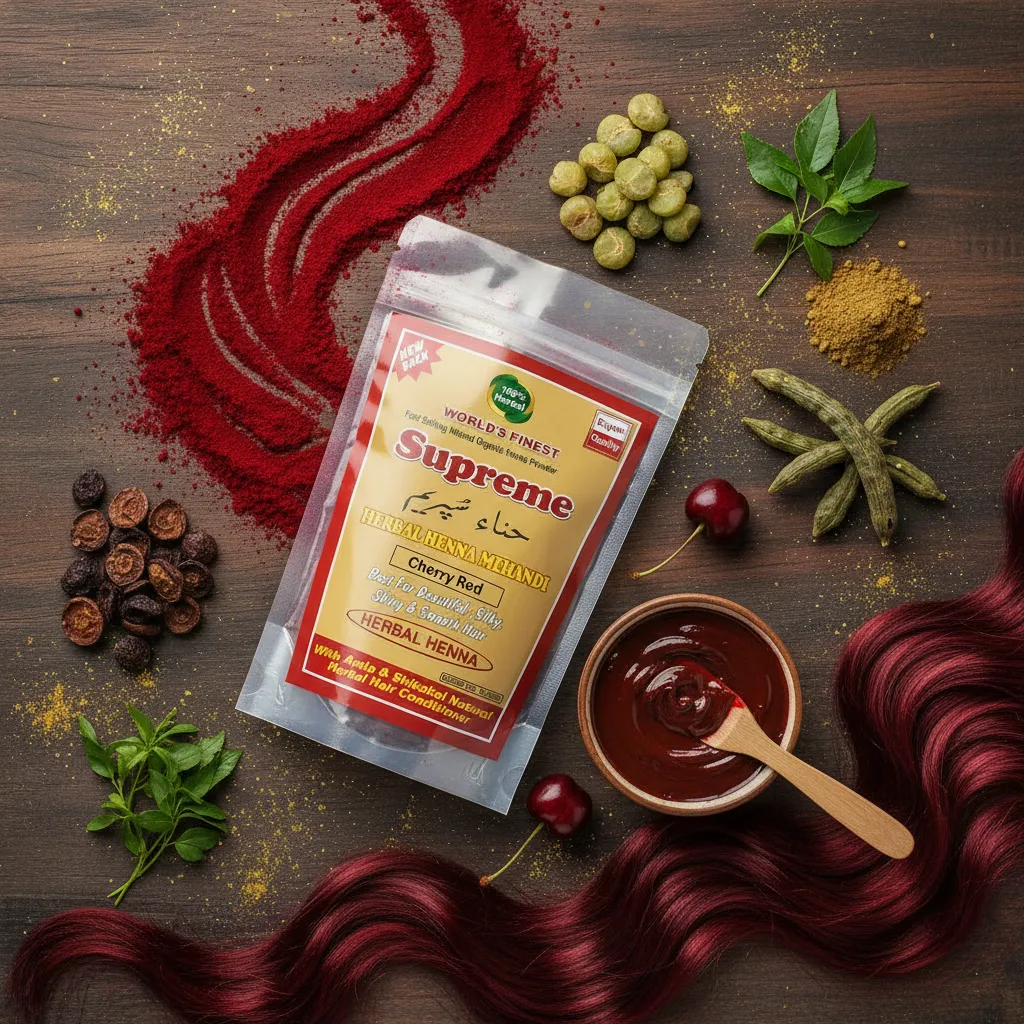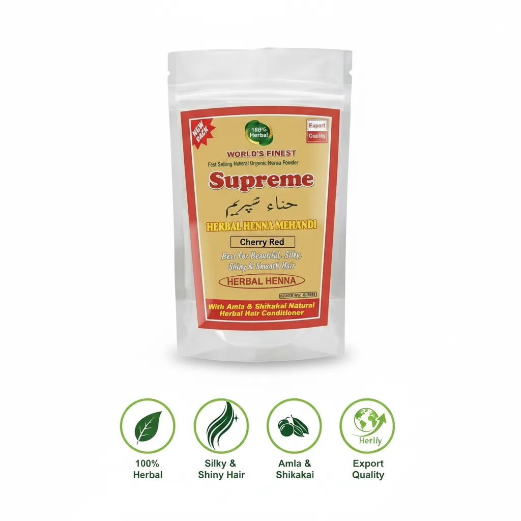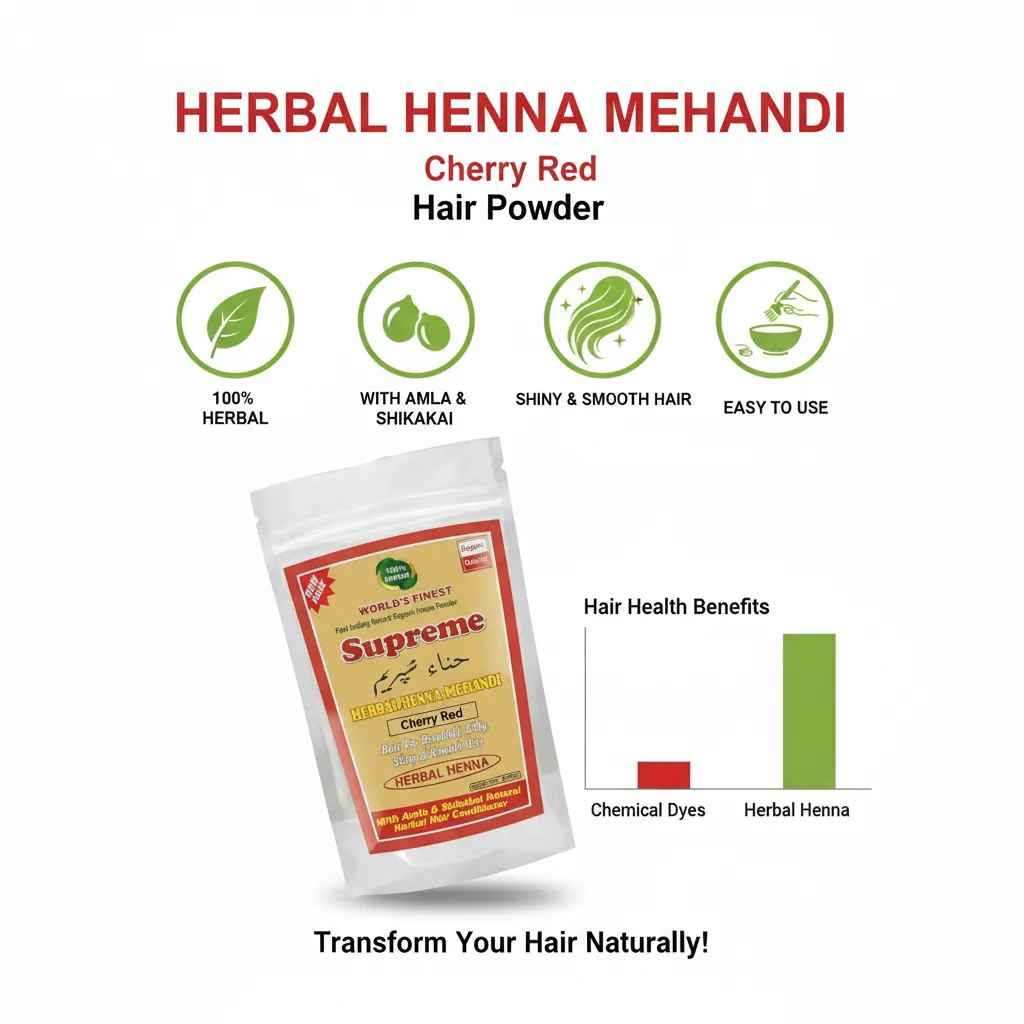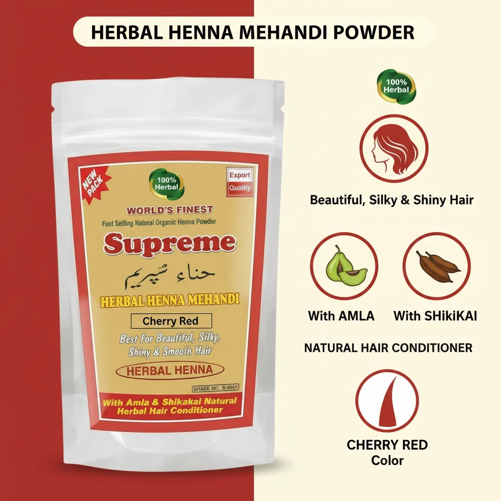Supreme Herbal Henna Mehndi Powder (Cherry Red) ek herbal hair color solution hai jo aapke baalon ko ek stylish aur attractive cherry red shade deta hai. Yeh un logon ke liye perfect hai jo chemical hair dyes ke bina ek unique aur vibrant hair color chahte hain.