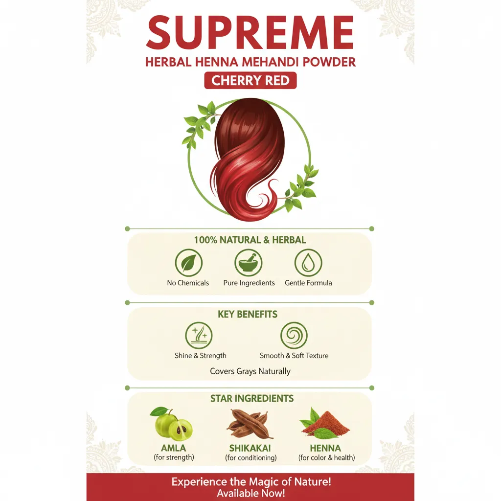 Agar aap apne hair ko ek fresh aur vibrant cherry red look dena chahte hain, to yeh mehndi powder ek perfect herbal choice hai.