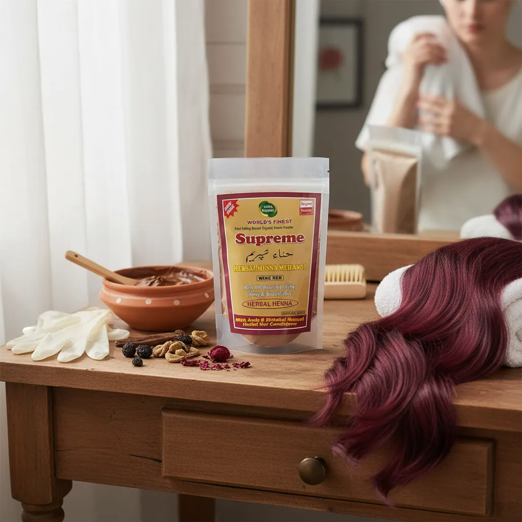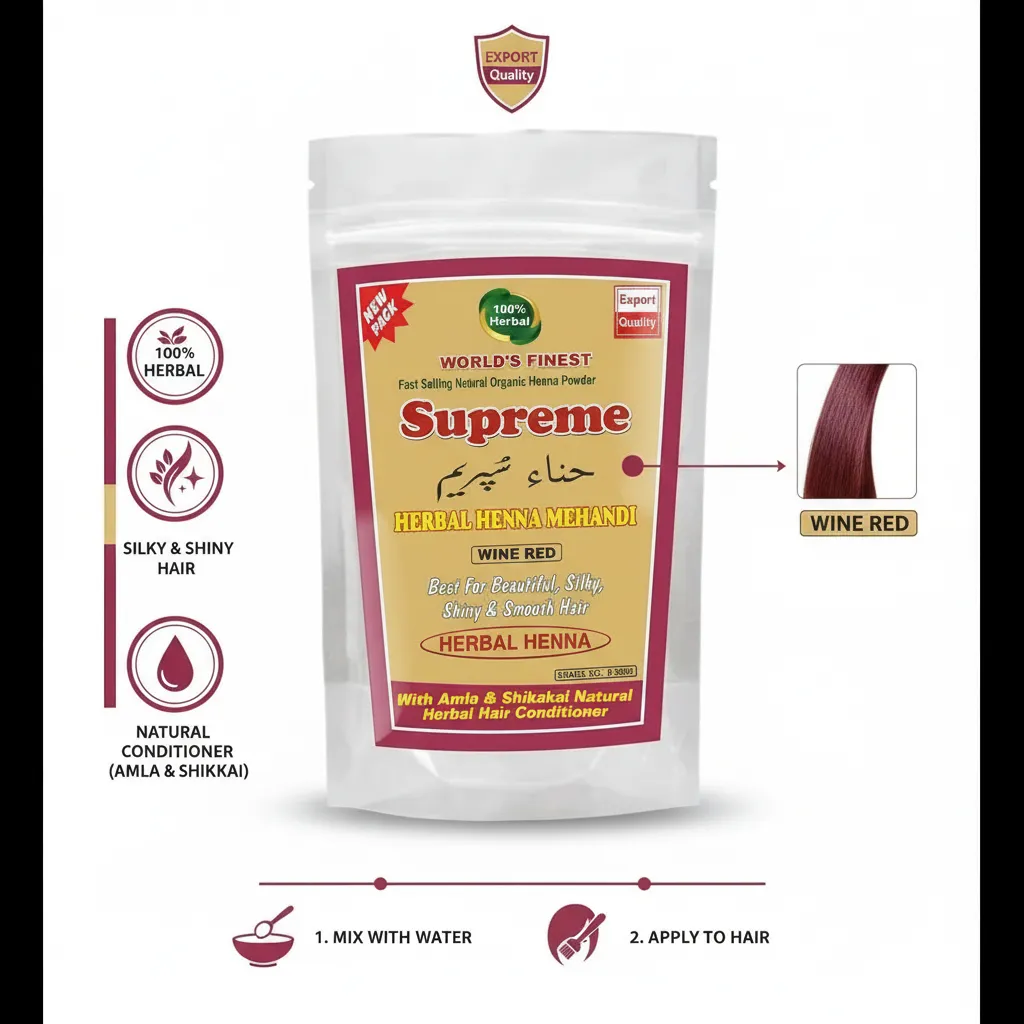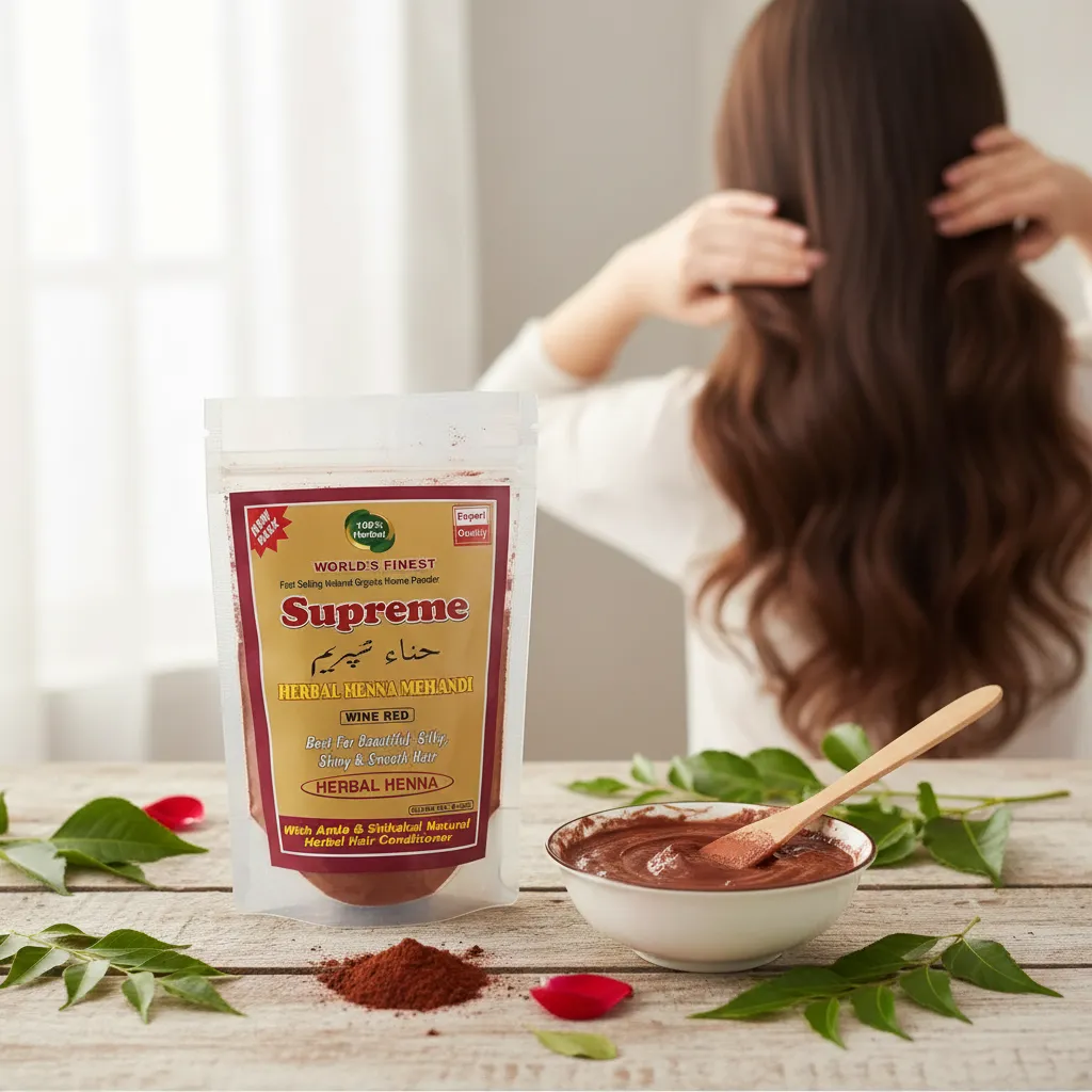 Supreme Herbal Henna Mehndi Powder (Wine Red) ek premium herbal hair color solution hai jo aapke baalon ko ek stylish aur elegant wine red shade deta hai. Yeh un logon ke liye perfect hai jo ek deep, rich aur modern hair color chahte hain bina harmful chemicals ke.