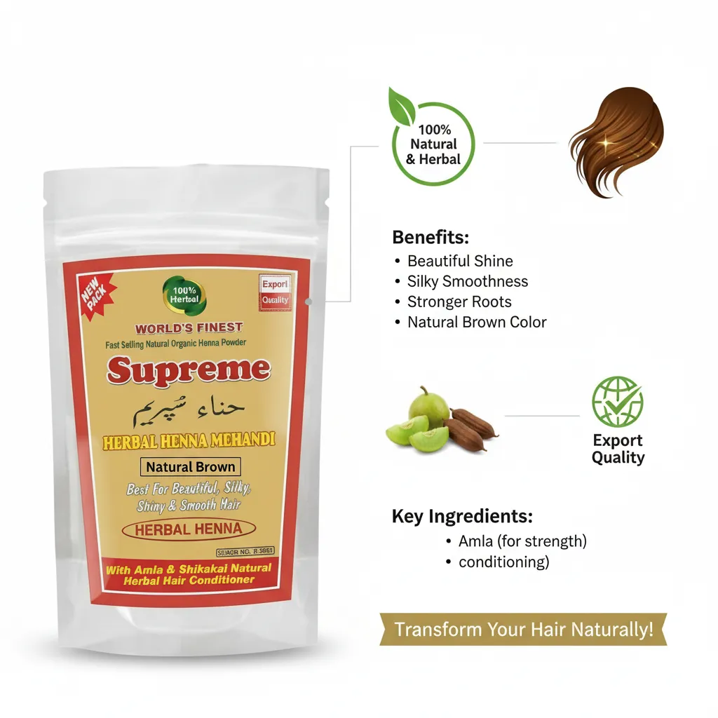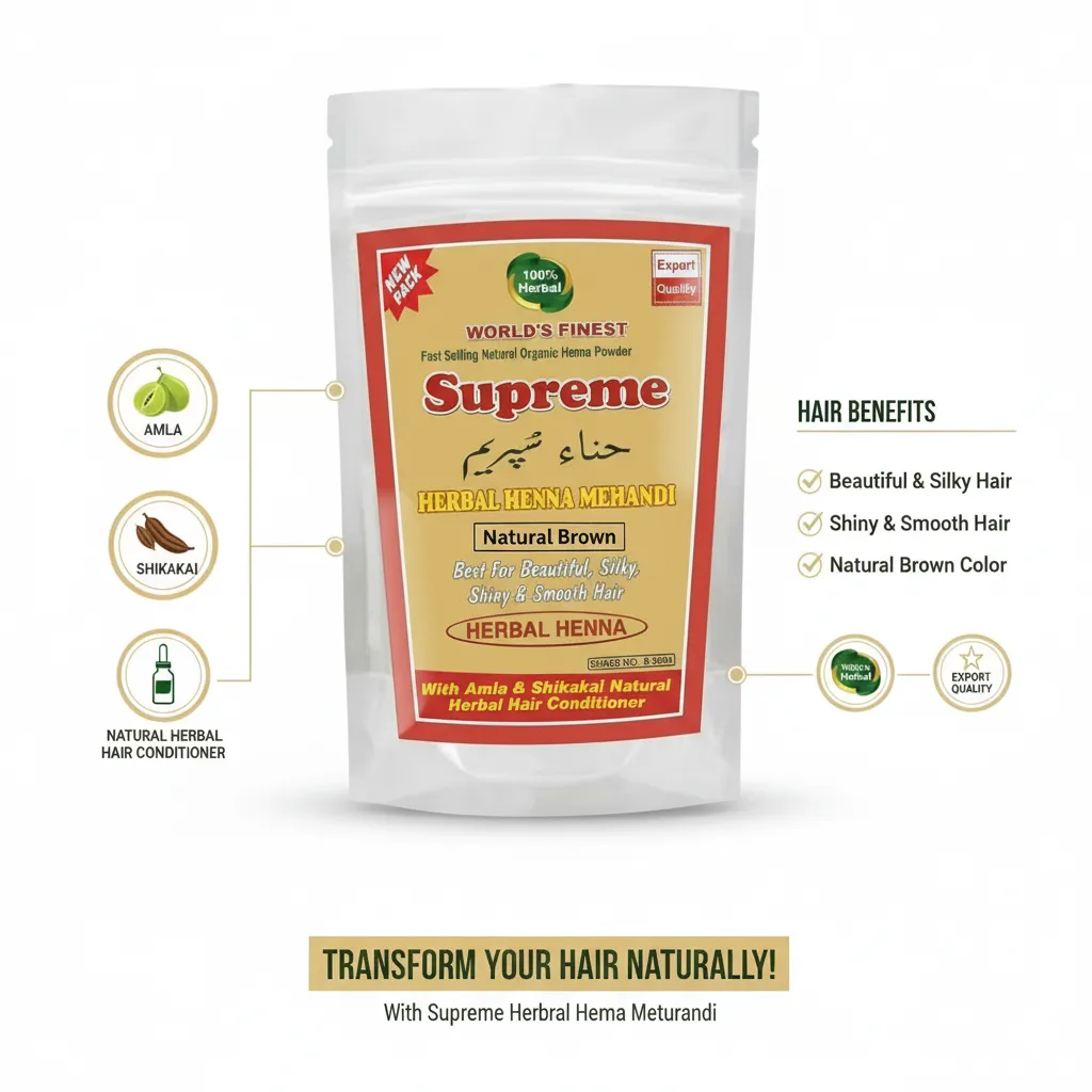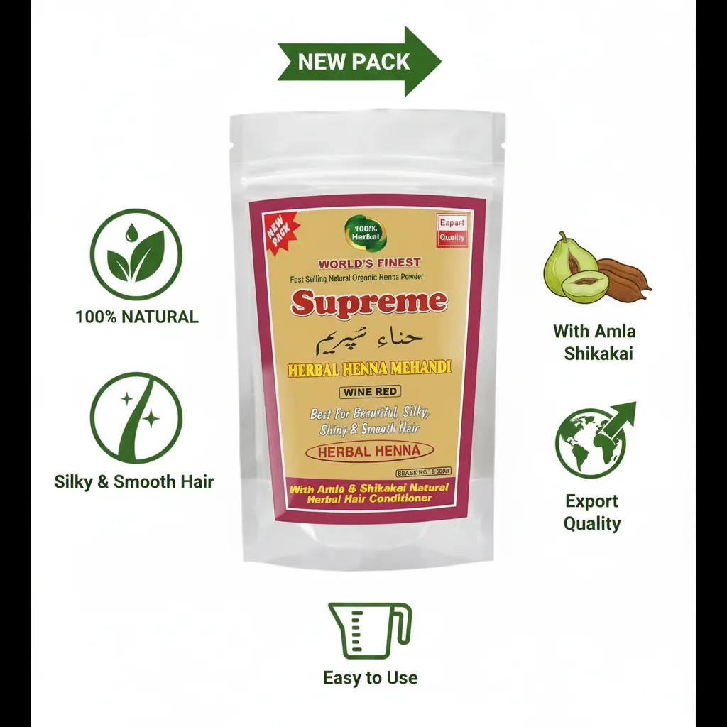 Supreme Herbal Henna Mehndi Powder (Wine Red) ek premium herbal hair color solution hai jo aapke baalon ko ek stylish aur elegant wine red shade deta hai. Yeh un logon ke liye perfect hai jo ek deep, rich aur modern hair color chahte hain bina harmful chemicals ke.