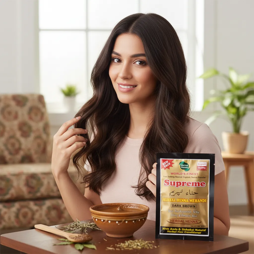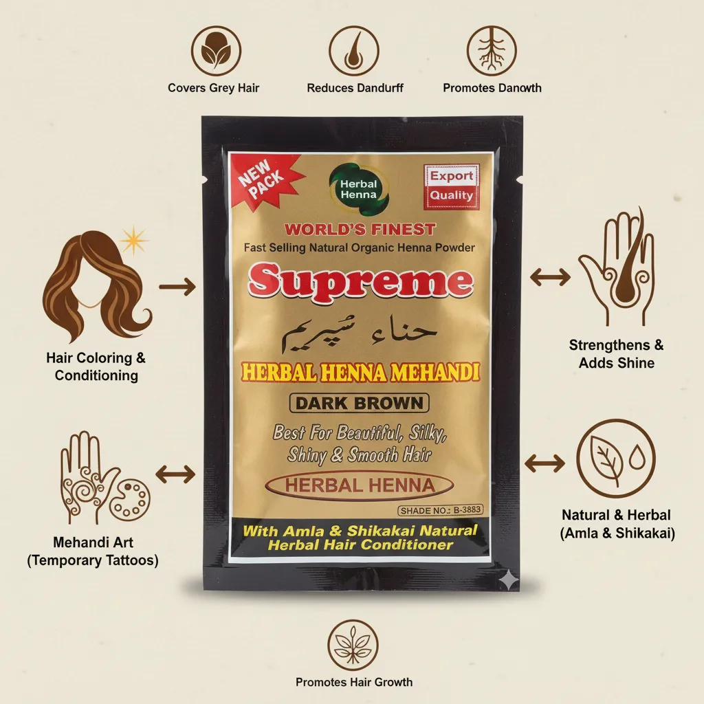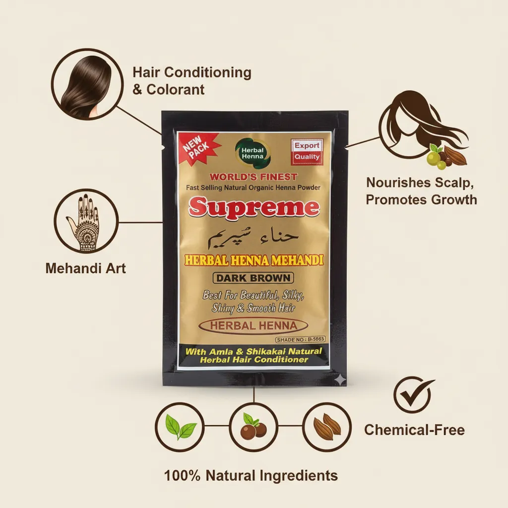 Supreme Herbal Henna Powder (Dark Brown) is a premium natural hair care solution that provides a rich dark brown shade while deeply nourishing and conditioning your hair. It is a perfect choice for those who want a natural alternative to chemical-based hair dyes without compromising on color or hair health.