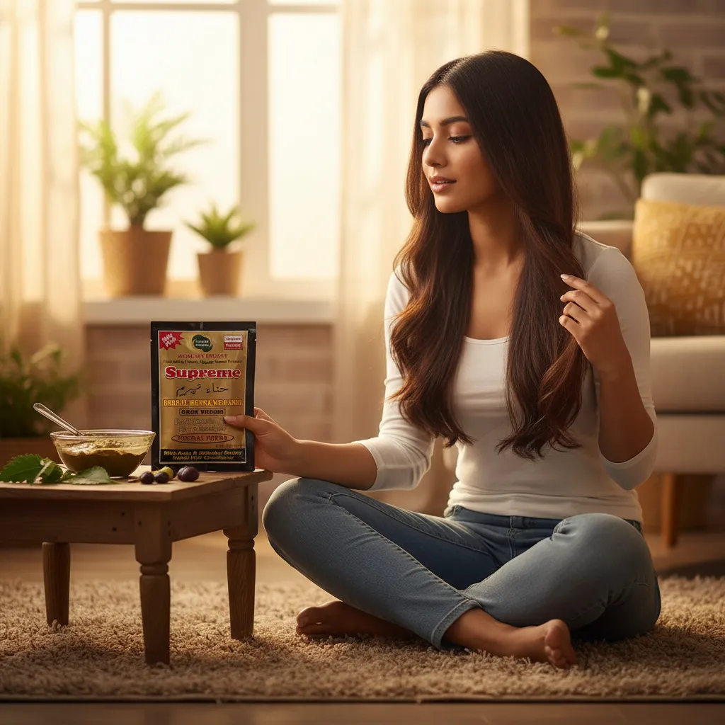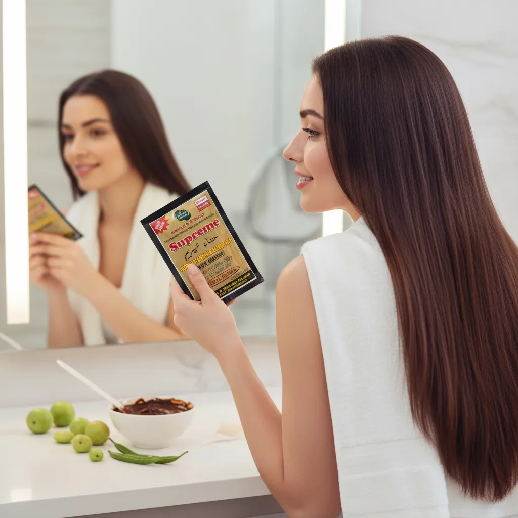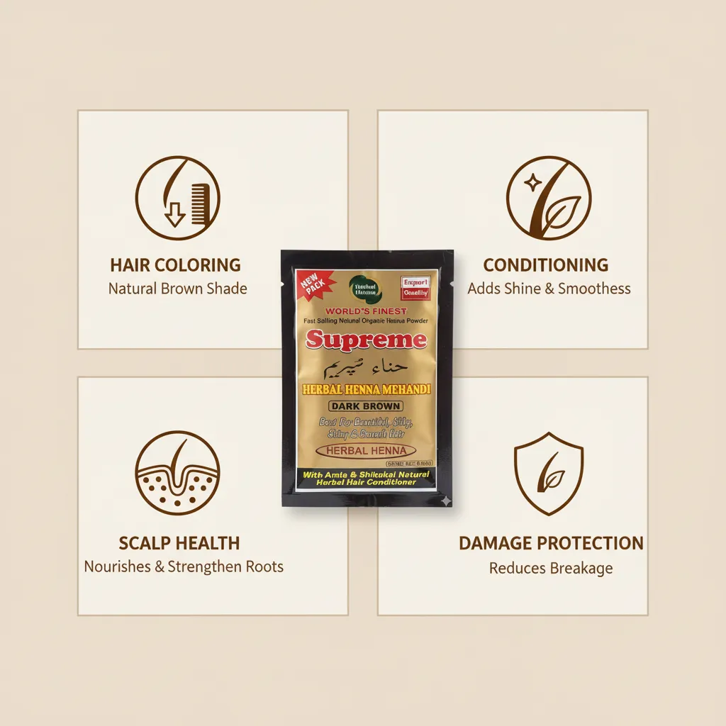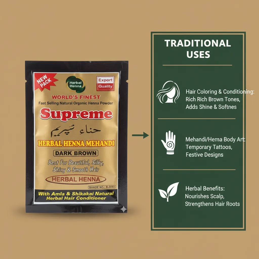 Supreme Herbal Henna Powder (Dark Brown) is a premium natural hair care solution that provides a rich dark brown shade while deeply nourishing and conditioning your hair. It is a perfect choice for those who want a natural alternative to chemical-based hair dyes without compromising on color or hair health.